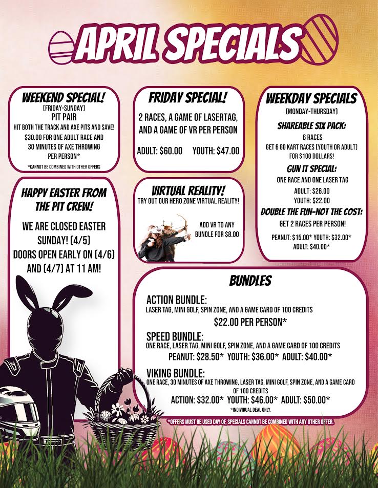 April showers bring May flowers, but until they arrive there is fun at The Pit! Don't let the unpredictable weather get you down. Rain or shine everything is open (and dry) at The Pit. I've turned over Specials to my staff and they've created soem new ways tio save! We've extended our hours for Spring Break and added specials to go along with it.